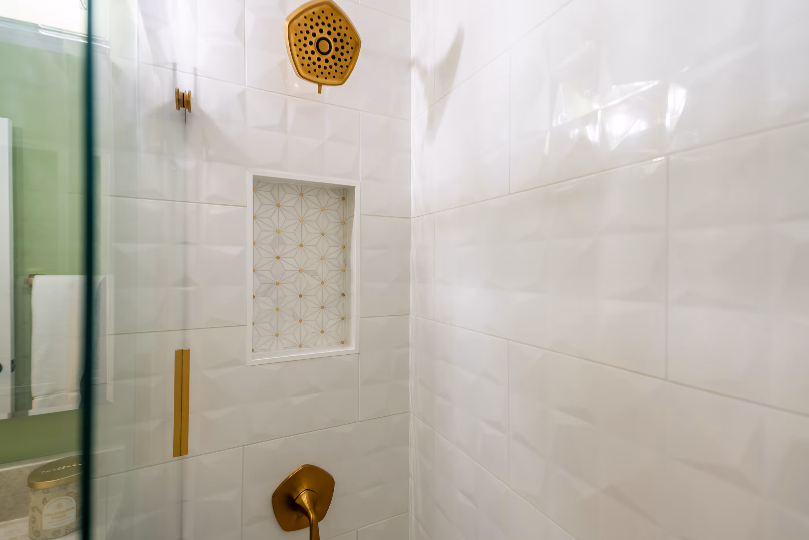 The floor was already up, so in-floor radiant heat was an easy addition. In an older, under-insulated house, the bathroom is now the warmest room in it — consistent, comfortable, and noticeable every morning stepping off cold hardwood floors. The fixtures went gold throughout, sourced and matched through vendor relationships so everything actually coordinates. A tile niche went into the shower wall — white and gold tile, flush and clean, with storage where it's needed instead of products crowding the ledge. The vanity and toilet both went to comfort height. The cast iron tub, original to the house, stayed — it was worth keeping.