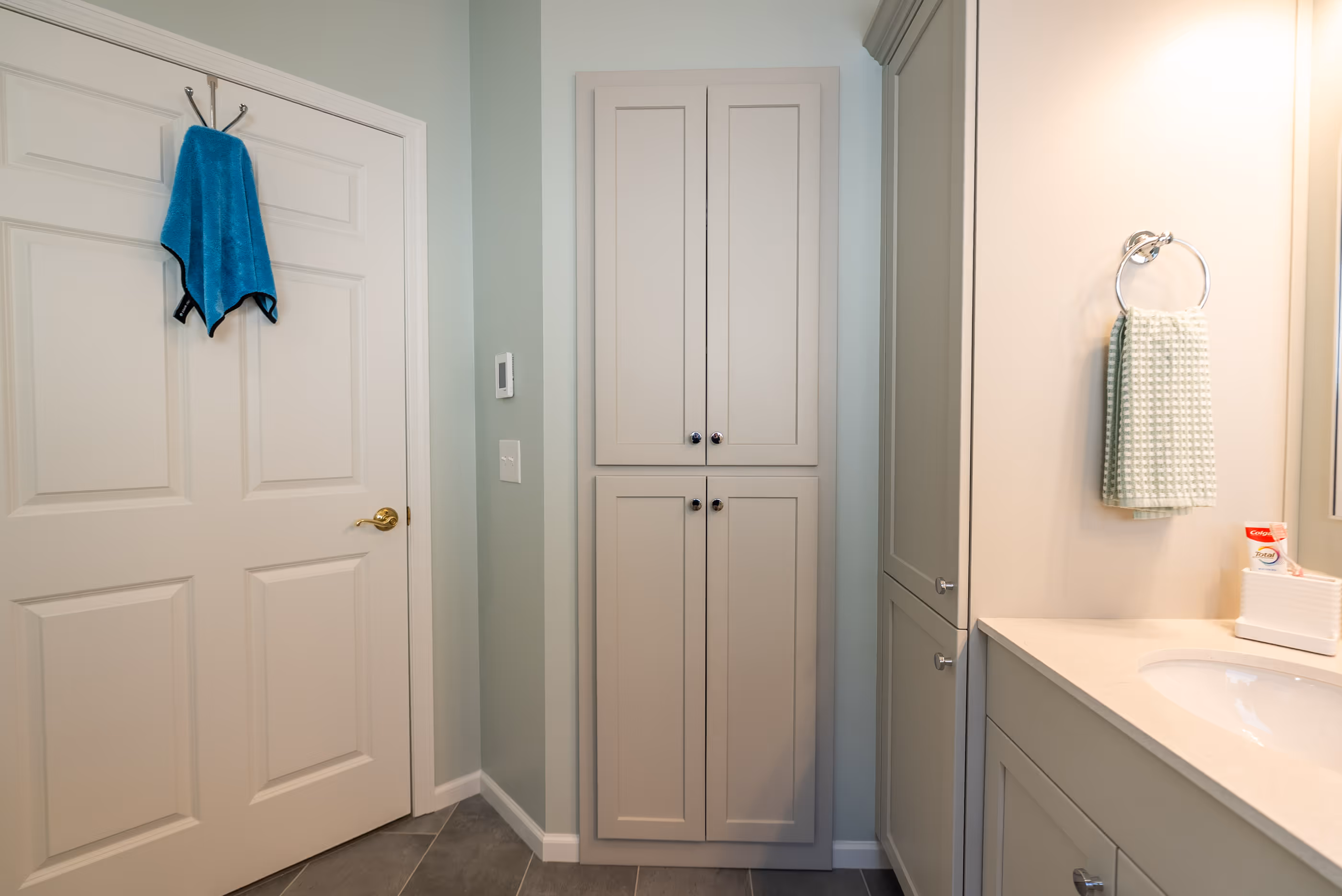 We pulled the Jacuzzi tub and used that reclaimed footprint for two things the bathroom was missing: an expanded shower and a full-height linen tower. Connie had been storing sheets wherever they'd fit. That problem disappeared. While the tile floor was up, we added in-floor radiant heat — the right move to make at the right moment. The entire trim package came out and went back in white. A comfort-height toilet and extended vanity completed the update.